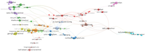 Visualization of network for affiliations on “additive manufacturing on lattice structure” research (data retrieved from WoS database on 20 June 2022 and visualized with VOS Viewer).