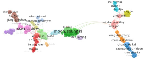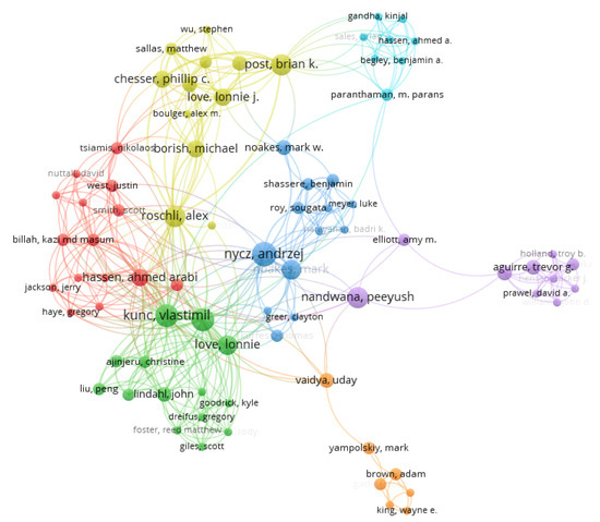 The scientometric analysis on publication authorship was conducted using the data from the publication databases. For the co-authorship analysis, the counting method used was the full counting method, and the publications that had above 25 authors were ignored from this study. The number of documents per author were limited to five, and 92 met the thresholds out of 4475 authors. The authors with the greatest total link strength were used in the selection. The threshold system used to filter the authorship was a minimum of one publication in the area, as 3446 authors met this threshold. In this data clustering, there were two methods considered in the analysis. For the first method, 17 clusters were used for the authorship, as seen in Figure 19 and Figure 20. The highest publications were identified in the green node by cluster 2 showing Seung Ki Moon as the most published author in additive manufacturing, with 23 links, 17 publications, and a total link strength of 45.