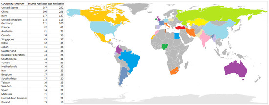 The VOSviewer is an open-source programme and was used in this study’s network modelling and visualisation [103,104,105,106,107,108]. Nees Jan van Eck and Ludo Waltman currently own the VOSviewer. For this study, the version of the software used is VOSviewer version 1.6.18, and it was run with Java version 1.8.0_333 and Microsoft Graph. It is important to note that when organising research subjects for the ensuing systematic review, both the scientific mapping of research communities and themes derived from literature coupling analysis and keyword co-occurrence analysis were taken into account. Numerous analyses were conducted from different angles, including analyses of the countries/regions’ activity, authorship, co-occurrence, keyword, literature coupling, and number of publications, as summarised in Figure 5.