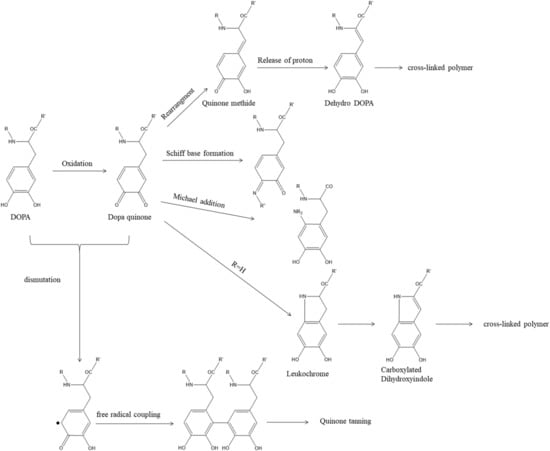 Due to the chemical versatility and affinity diversity of catechol functional groups, DOPA exhibits unique chemical properties. Thus, DOPA can boost the adhesion and cohesion of mussel adhesive proteins [,,]. Through its chemical versatility, DOPA can undergo different reactions to achieve bonding and cross-link curing [,]. As shown in Figure 1, DOPA can be oxidized to Dopaquinone under certain conditions. After that, Dopaquinone can be rearranged and dehydrogenated to form Dehydro DOPA, which results in further cross-linking; DOPA quinone can also undergo Michael addition and Schiff base formation with amino and thiol groups; it can also form Carboxylated dihydroxyindole through intramolecular cyclization, and finally form cross-links. At the same time, Dopaquinone and DOPA can also be disproportionated to form free radicals, and finally coupled to tannins (Quinone tanning).