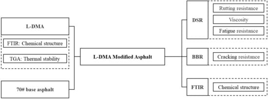 Although biomimetic materials have been used in asphalt materials, this work marks the first time the bionic mussel adhesion protein has been applied to asphalt materials. By analyzing its impact on the overall performance of asphalt, this study aims to investigate the viability of using bionic mussel adhesion protein in asphalt. L-Dopa Methacrylic anhydride (L-DMA) was synthesized based on the features of bionic mussel adhesion protein in this study and used to modify 70# base asphalt with varied quantities to prepare L-DMA-modified asphalt (L-DMA-A). The thermal stability and structural composition of L-DMA were investigated. In addition, the high-temperature rutting resistance and low-temperature cracking resistance of L-DMA-modified asphalt were examined by DSR and BBR. Finally, the modification mechanism of L-DMA-modified asphalt was analyzed by FTIR. The flowchart of the experiment design is shown in Figure 2.
