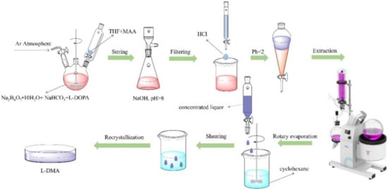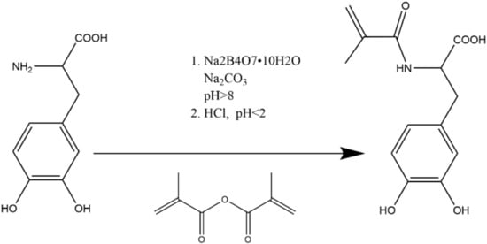 The mechanism of the synthesis process of L-DMA [] is shown in Figure 3. An amount of 24 g of Na2B4O7•10H2O and 10 g of NaHCO3 were accurately weighed and dissolved in 200 mL deionized water and aerated with Ar for 20 min, then 10.4 g of L-DOPA (52.8 mmol) was added and continued to be bubbled with Ar. After 5 min, 9.5 g of MAA (58.1 mmol) was dissolved in 50 mL of THF and slowly dropped to the above solution. During the dropwise addition, 1 mol/L NaOH solution was used to keep the pH of the solution above 8. The reaction mixture continued to be stirred for 18 h at room temperature and protected from light.