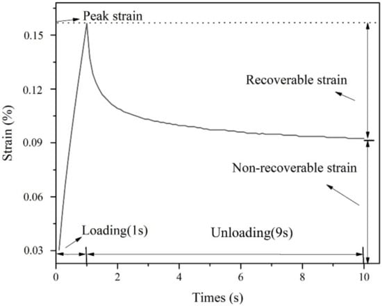 Additionally, L-DMA-modified asphalt with different L-DMA contents were tested by loading–unloading mode in the Multiple Stress Creep and Recovery (MSCR) test, which can be used to characterize the high-temperature performance of asphalt []. In this paper, the MSCR tests under stresses of 0.1 kPa and 3.2 kPa were carried out at 58 °C. The whole test contained 20 cycles of creep and recovery. Specifically, the first 10 cycles were conducted under the stress of 0.1 kPa, and the following 10-cycle test under the constant stress of 3.2 kPa was further conducted to finish the whole test. Figure 5 shows the creep and recovery (loading–unloading) curves of asphalt in one cycle.
