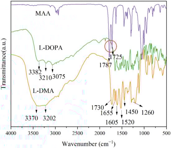 FT-IR spectra results of MAA, L-DOPA, and L-DMA.
