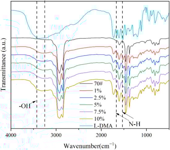 We added a certain mass ratio of L-DMA into the heated 70# base asphalt and mixed manually for ten minutes. To guarantee a good dispersion of L-DMA, a shear apparatus was used to disperse L-DMA at a rate of 4000 r/min for 40 min at a temperature of 170 °C. The dosage of L-DMA was 1%, 2.5%, 5%, 7.5%, and 10% of asphalt, respectively.