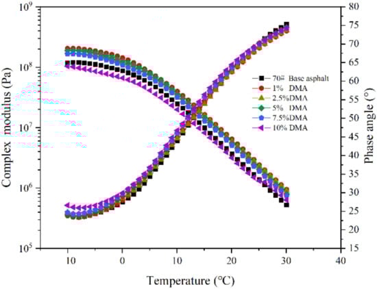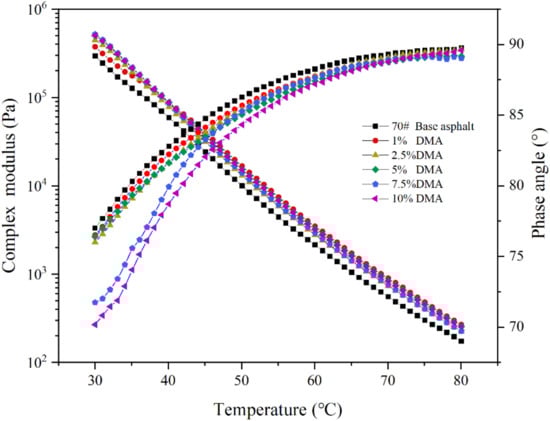 When L-DMA is added to asphalt as a modifier, physical and chemical modifications will inevitably occur, thus affecting the original structure and the viscoelastic properties of asphalt. In general, the composite shear modulus G* is the measurement of the total resistance of the material during repeated shear deformation [,]; the phase angle δ is the relative index of the number of recoverable and irreversible deformations.