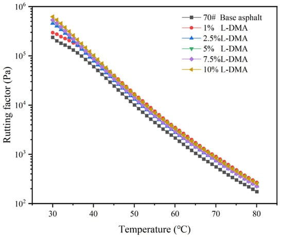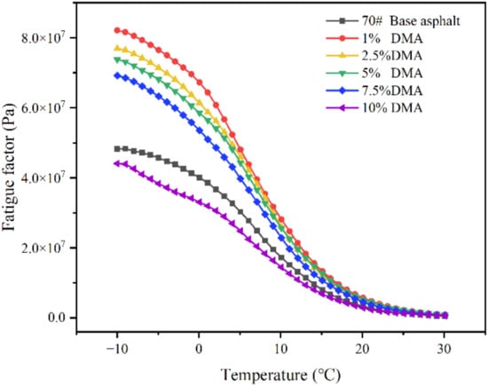 Figure 12 shows the changing trend of the fatigue factors of 70# asphalt and modified asphalts with different contents of L-DMA at different temperatures. The results show that the fatigue factor of modified asphalt increases first and then decreases with an increase in L-DMA content. At a high content of 10%, the addition of L-DMA decreases the fatigue factor and enhances the fatigue resistance of asphalt due to the conjugation between the unsaturated rings of L-DMA and asphalt.