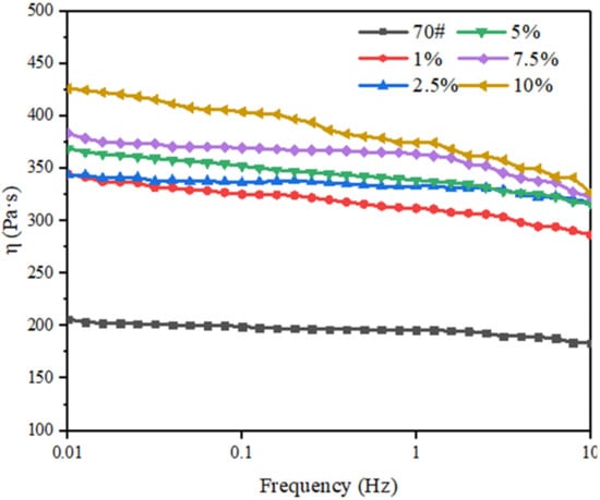 Asphalt pavement will be affected by vehicle load during the service process. Loading with different frequencies will cause different deformations of asphalt pavement, and the deformation size determines the high-temperature performance of asphalt pavement. Viscosity is an essential parameter of asphalt and the addition of L-DMA will affect the viscosity of asphalt binder. Therefore, it is necessary to study the variation trend of the viscosity of 70# asphalt and L-DMA-modified asphalt under different load frequencies. The specimens were subjected to a frequency sweep in the range of 0.01–10 Hz. In order to meet the practical application of pavement, the temperature was set to 58 °C.