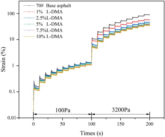 The strain changes of 70# base asphalt and L-DMA-modified asphalt under different stress levels at 58 °C are shown in Figure 14. The result shows that the 70# base asphalt has the largest cumulative strain. With an increase in L-DMA content, the cumulative strain of the modified asphalt gradually decreases. This is because the cohesion between L-DMA and asphalt improves the elasticity of asphalt materials, significantly improving the recoverable deformation ability of asphalt and thus improving the high-temperature performance of asphalt.