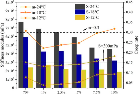 Low-temperature cracks are inevitable in the use of asphalt pavement. Improving the low-temperature performance of asphalt pavement is the top priority of road workers. In general, BBR is most commonly used for the low-temperature performance evaluation of asphalt. According to the specification AASHTO T313-12 [], 70# asphalt and L-DMA-modified asphalt beams were prepared, respectively, then held 1 Dh at the test temperature and were subjected to a 4 min loading test to measure the creep stiffness modulus S and creep rate m. S and m were selected at 60 s, if S ≤ 300 MPa and m ≥ 0.3 at this condition, then the asphalt is applicable at this temperature condition.