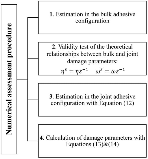 The proposed assessment protocol uses macroscopic experimental data on structural adhesives under standard characterization tests. To this aim, experimental data from Murakami and coworkers [] concerning tensile and torsional tests on the epoxy-based structural adhesive XA7416 (3M Japan Ltd., Tokyo, Japan) and from Kosmann and coworkers [] concerning torsional test on epoxy adhesive Henkel Hysol EA9695 AERO 0.05 NW (Henkel AG and Co., Düsseldorf, Germany), were chosen. Experimental data were extracted from [,] by using the free online software WebPlotDigitizer []. Numerical simulations were carried out by numerically solving the differential problem Equations (1) and (2) with Equations (10) and (11), using the commercial software Mathematica []. The estimation procedure is schematized in the flow chart in Figure 1.