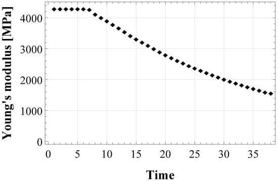 First, an estimation process in the bulk configuration is performed. To this aim, experimental results of a tensile test on a bulk adhesive specimen (Figure 7 in []) have been used to calculate the evolution of the experimental Young’s modulus in time, shown in Figure 2.