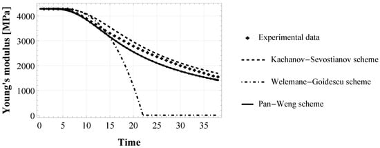 The behaviour of the apparent Young’s modulus of the epoxy-based adhesive XA7416 is represented in Figure 2. At the beginning of the tensile test (elastic domain), it is constant and equal to  MPa, then it degrades in time as an effect of the micro-cracks accumulation. This experimental finding was used to assess damage parameters in the bulk adhesive. Figure 3 shows the three numerical models obtained by implementing the evolution of the cracks density (Equation (9)) in the three schemes for damaged material, i.e., Equation (5), (7) and (8), respectively for KS, WG, and PW scheme.