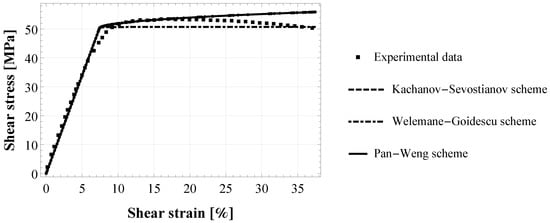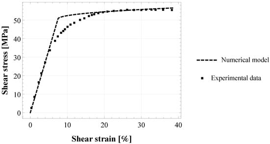 where  is the damage initiation shear stress. Equation (12) was fitted to the experimental shear strain-stress curves (cf. Figure 10 by [] and Figure 8 by []) to derive model parameters  and , then the damage parameters,  and , were estimated by using the following expressions: