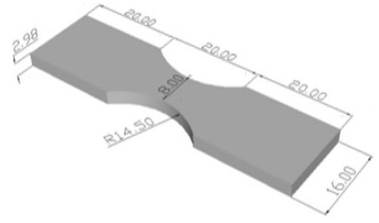 The specimens were prepared according to the above-mentioned standard for fatigue testing [2]. The geometry of the rectangular specimen with a size of 60 × 16 × 2.98 mm subjected to fatigue testing is presented in Figure 1. Experimental fatigue testing was performed at Russenberger Prüfmaschinen AG, Switzerland, using the Cracktronik machine at ambient temperature, and the Rumul soft expert software.
