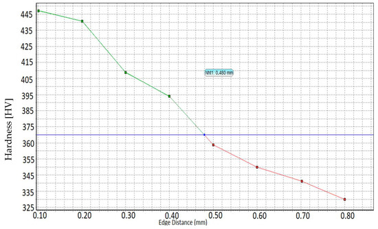 Micro-hardness measurements were performed, starting from the outside to the inside, with a load of 0.5 Kgf for each gas and salt thermochemically treated specimen. The depth of the nitration case was determined by the distance from the surface to the point where the micro-hardness, determined according to DIN 50190 Part 3, was greater by a minimum of 50 HV than core hardness. Micro-hardness measurements were performed using a KB micro-hardness meter at the Härterei Reese laboratory in Brackenheim, Germany.