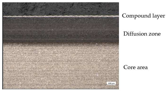After nitrocarburizing, the microstructure consisted of three zones: a compound layer at the surface, a diffusion zone, and an unaffected core area, as shown in Figure 8.