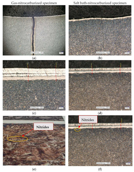 Metallographic analysis of gas- and salt bath-nitrocarburized specimens; (a) gas-nitrocarburized specimen, and microscopic crack control (Nital attack 3%); (b) salt bath-nitrocarburized specimen, microscopic crack control (Nital attack 3%); (c) gas-nitrocarburized specimen, microscopic control (×1000) with white layer thickness of 18.2–20.1 µm; (d) salt bath-nitrocarburized specimen, microscopic control (×1000) with white layer thickness of 10.8–11.2 µm; (e) nitride in the gas-nitrocarburized specimen, microscopic control (×1000); (f) nitride in the salt bath- nitrocarburized specimen, microscopic control (×1000).