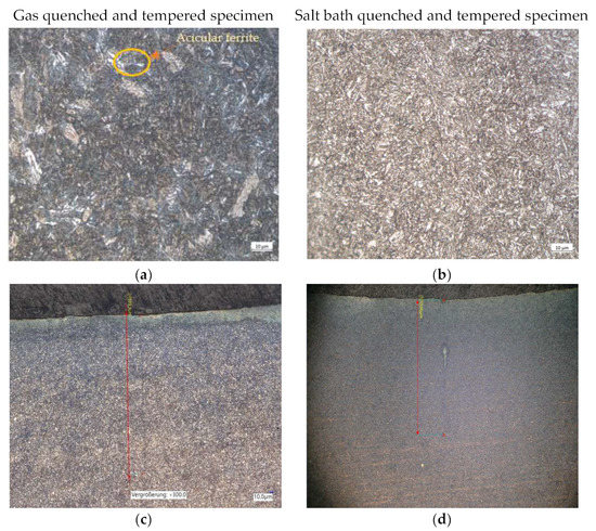 Microstructure obtained after gas and salt bath quenching and tempering; (a) microstructure—gas quenched and tempered specimen; (b) microstructure—salt bath quenched and tempered specimen; (c) determination of the crack length under the optical microscope (×300)—gas quenched and tempered specimen is 599.3 µm; (d) determination of the crack length under the optical microscope (×100)—salt bath quenched and tempered specimen is 1536 µm.
