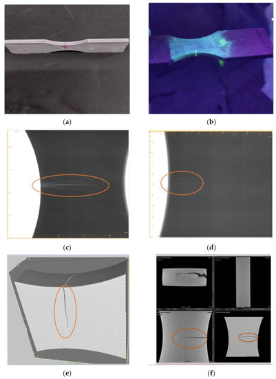 Non-destructive testing of gas- and salt bath-nitrocarburized specimens; (a) fluorescent analysis—gas-nitrocarburized specimen; (b) fluorescent analysis—salt bath-nitrocarburized specimen; (c) X-ray analysis—gas-nitrocarburized specimen; (d) X-ray analysis—salt bath-nitrocarburized specimen; (e) computed tomography—gas-nitrocarburized specimen with a crack length of 5.62 mm; (f), computed tomography—salt bath-nitrocarburized specimen with a crack length of 1.5 mm.