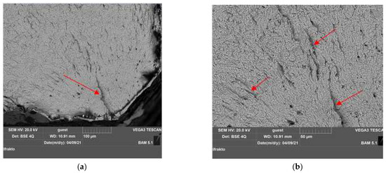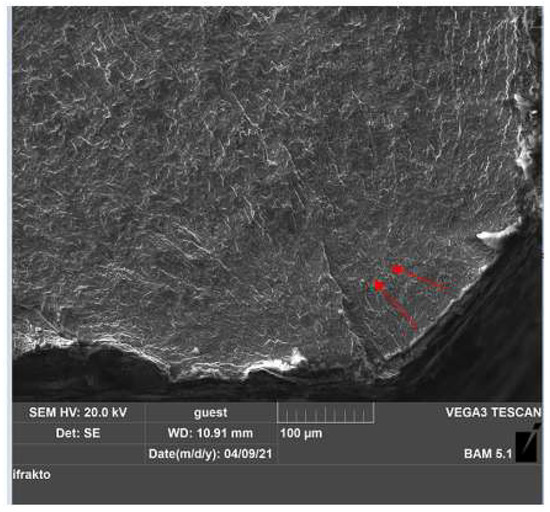 Figure 13 also presents cracks but at high magnification. On the fatigue fracture surfaces, the characteristic features such as the elliptical crack front, the indicated striations, and secondary cracks were documented.