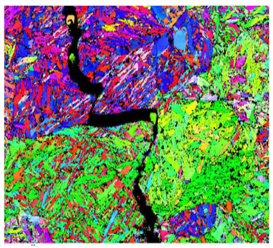 7. The critical area of the analyzed specimen was identified in the calibrated region b = 8 mm, where the surfaces were subjected to stresses and the stress concentration was maximum. It can be seen that the nanostructure of the material was destroyed with increasing amplitude, with micro-cracks destroying the crystalline lattice. Each crystalline grain had its orientation at the crystallographic level. The high-amplitude room temperature fatigue testing showed that the crack passed through the crystal (intragranular crack).