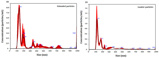 NTA particle size distribution analysis of unloaded and loaded systems. Representative histograms of the average size distribution (black line) from three measurements of a single sample. Red areas specify the standard deviation (SD) between measurements, and blue numbers indicate the maxima of individual peaks.