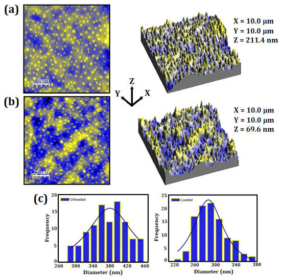 Figure 2 shows the micrographs of the unloaded and loaded particles, which presented an almost spherical morphology. The average size of the unloaded particles (Figure 2a) was found at around (366 ± 43) nm and a PDI of (0.17 ± 0.03). The loaded particles (Figure 2b) presented an average size of (284 ± 30) nm and PDI of (0.23 ± 0.03). Spherical morphology, as well as regular distribution of peaks and valleys along the particle surface (Figure 2c), are significantly in a controlled release formulation, due to the required uniform adhesion on another surface [64]. The AFM results presented differences of the average size distribution for unloaded and loaded particles. However, both techniques pointed to the decreased diameter of the loaded particles. Moreover, it is important to consider the sensitivity of NTA and AFM equipment [65].