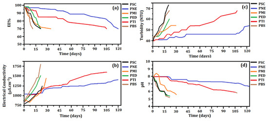 Figure 3c shows the evolution of turbidity as a function of time for all systems. At t = 0, all systems presented a turbidity around (40 ± 1) NTU. This fact shows that the addition of preservatives did not influence the initial turbidity values. However, as in the evaluation of EE% and electrical conductivity, the greatest turbidity variations were observed in the PSC, PMI, PBS, and PED systems.