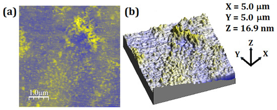 The surface roughness of the unloaded and loaded systems was evaluated through four different topography images, obtained in different regions of the surface of each sample. Figure 2a,b shows representative images of the surface of the unloaded and loaded particles, respectively. The arithmetic mean surface roughness of particles (Ra) is defined as the mean absolute deviation of irregularities in midline roughness along a surface length [66]. The mean square roughness (Rq) is the standard deviation of the surface height distribution and describes the surface roughness. The Ra and Rq values obtained for the unloaded particles were (9 ± 1) and (11 ± 2), respectively. Considering the loaded particles, Ra = (15 ± 1) and Rq = (20 ± 2) were obtained. These results revealed the influence of the essential oil on the surface roughness of particles after the encapsulation process [67]. Our results suggested that the loaded particles presented better conditions for application as a releasing product, due to its higher roughness and microtexture, favoring an efficient adhesion on another surface [68].