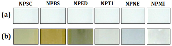 The systems containing encapsulated essential oil and preservatives (PNE, PMI, PBS, PTI, and PED) were stored at (5 ± 2) °C. Viscosity and phase separation were observed after 24 h, as well as flocculation and coalescence. All systems showed larger agglomerates separated from the rest of the emulsion, as reported previously [80]. The developed systems were not suitable for storage at low temperatures, as expected, due to the presence of the gelatin carrier.