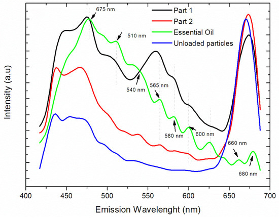 The developed formulation containing different preservatives was fully characterized. Encapsulation Efficiency (EE%) was evaluated using Ultraviolet–Visible (UV–VIS) spectroscopy. Nanoparticle Tracking Analysis (NTA) and zeta potential were used for particle size distribution and surface charge measurements, respectively. Atomic Force Microscopy (AFM) allowed the evaluation of the particle’s morphology and surface roughness parameters. The stability evaluation of the developed systems followed the Cosmetic Products Stability Guide [29], based on (i) preliminary stability, (ii) stability under constant handling at (25 ± 2) °C, and (iii) shelf-life tests at (25 ± 2) °C and (35 ± 2) °C. The most stable system was analyzed using Laser Scanning Confocal Microscopy (LSCM). Fluorescence measurements and Attenuated Total Reflectance–Fourier-transform Infrared Spectroscopy (ATR–FTIR) were applied specifically to analyze the complexation of the essential oil and carrier. Finally, the controlled release [31,32] of essential oil was evaluated under different pHs (4, 7, and 10).