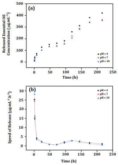 A colloidal system containing the loaded particles (15 mL) was inserted into a dialysis tubing cellulose membrane and suspended in water (85 mL; 25 °C) at pH = 4, 7 or 10. The system was maintained under continuous magnetic stirring (100 rpm). A 3 mL aliquot was withdrawn from the flask at regular time intervals (up to 220 h). Absorbance was measured at 278 nm on a Epoch2 Microplate Reader Biotek. The amount of released essential oil was calculated from a standard curve. The cumulative release (%) of essential oil was obtained from the following equation: [Cumulative release (%) = (amount of essential oil released after time t/total amount of encapsulated essential oil) × 100] [45].