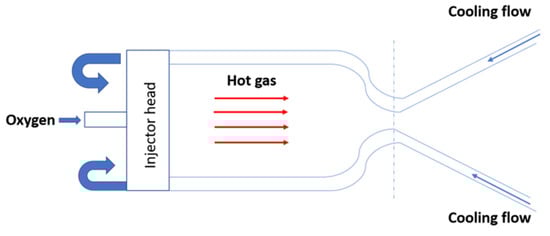A schematic of the rocket engine thrust chamber is reported in Figure 1. Figure 2a shows a schematic view of the adopted numerical modelling strategy, highlighting the above-mentioned improvements provided by the present work. The boundary conditions applied in the previous work and those considered with the proposed sub-modelling approach are summarized in Figure 2b,c.