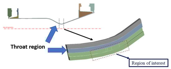 Because the maximum values of heat flux are expected in the throat region of the combustion chamber (see Figure 4), a local model of the throat region was analyzed to reduce the computational burden required to investigate the whole chamber, see Figure 4. A numerical analysis of the global model with the same element size of the local model was also conducted; the saved computation time is significant as the global model analysis is about 12 times slower than that detected adopting the sub-modelling approach.