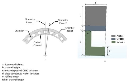 The thrust chamber structure is composed by electrodeposited layers made of copper and nickel on the outside with a CuCrZr alloy element on the inside. A regenerative cooling system was adopted to remove heat from the inner structure of the thrust chamber, through a flux of methane in the axial cooling channels. Being a regenerative cooling system, the same cooling fluid is also injected as fuel into the combustion chamber. Elevated thermal gradients exist through the inner chamber wall (ligament) that separates the cooling channels from the hot gas. In this context, several efforts have been made to optimize the regenerative cooling channel. Xu et al. [] established a design model based on the back propagation neural network to improve the overall cooling performances. Atefi et al., presented an optimization of channel dimensions by minimizing the thermal resistance between cooling fluid and hot gas with a defined pressure drop [].
