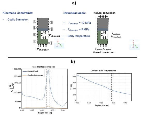 Pressures of the hot gases and of the cooling fluid were considered as uniform and equal to 5 and 12 MPa, respectively. The thermal and structural boundary conditions are shown in Figure 6. Coolant bulk temperatures, combustion gases and their respective heat transfer coefficients, which varied along the axis of chamber, were carried out by computational fluid dynamics (CFD) analyses [,]. The heat transfer coefficients and bulk temperatures to be applied in the local model thermal analyses, ranged between the dashed lines in Figure 6b. Natural convection conditions were considered on the external surface of the closeout structure. Displacement and temperature boundary conditions applied to the cut surfaces were retrieved by the results of thermal and structural analyses performed on the global model. Finally, the initial temperature was set to 293 K.
