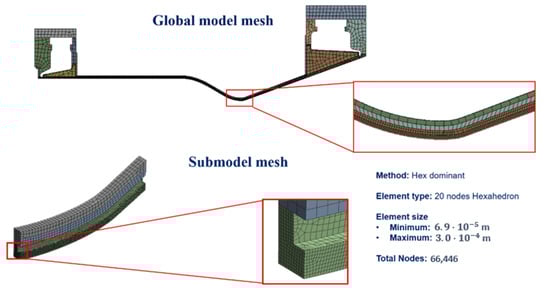 As mentioned earlier, instead of assigning predefined boundary conditions on the cut surfaces of the throat area (as conducted in []), a sub-modeling approach was adopted. Namely, a global coarse model was built to accurately evaluate the displacement and thermal boundary conditions to be applied on the cut surfaces of the local model [].