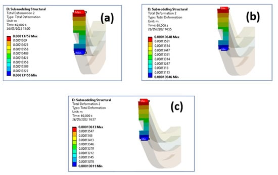 A one-way thermal-structural coupling was employed. Hence, the temperature field influences the strain/stress response, and not vice versa. Several papers from literature demonstrated that such an approximation provided accurate results [,,,].