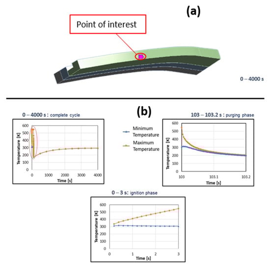 A time step convergence analysis was conducted since the choice of the time step size could have a significant impact on the final results. Especially in the ignition and in the purging phase, temperature variations over time were very steep, with the consequent need to set very small time steps, especially at the beginning of those phases. In particular, an automatic time step algorithm was selected, choosing the initial, minimum and maximum time step sizes; these were automatically increased or decreased during the progression of analysis. More specifically, in the time stepping algorithm used by ANSYS the time increment at the time step n + 1, , is considered to range between the following values: