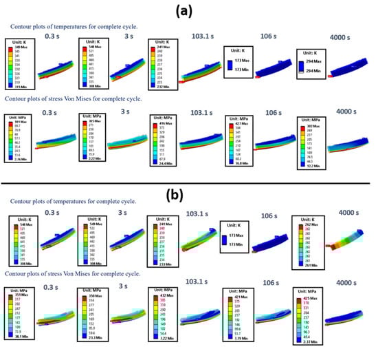 Temperature and von Mises stress contour plots at the most significant time instants of the first cycle, considering predefined boundary conditions on the cut surfaces (a), and the displacement/temperature on the cut surfaces evaluated by FEM global analysis (b).