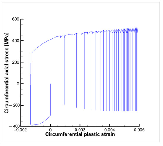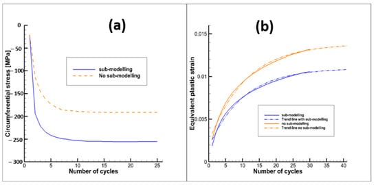 Figure 14b shows the evolution of the equivalent plastic strain cycle by cycle for both of the considered numerical analyses. It is worth noting that the adoption of sub-modelling approaches allows one to obtain smaller equivalent plastic strains at the end of the cycle with respect to the approach with predefined boundary conditions (with no applied constraints along the axial direction). The main reason of this result is that the applied compressive boundary conditions, adopting sub-modelling techniques, allows one to obtain smaller tensile plastic strains when the thermal-mechanical loads are reversed during the purging phase.