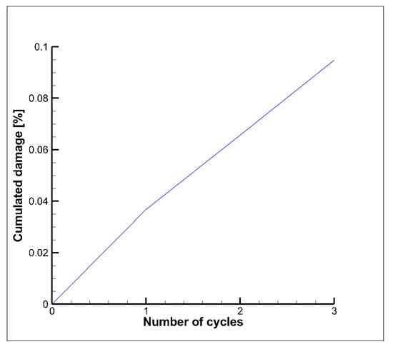 All the fatigue evaluations have been conducted using the commercial code ncode DesignLife, which works in the post-processing phase, namely after the solution of the non-linear structural analyses, and processes the calculated stress and strain field adopting the SWT method. Then, an evaluation of the cumulative fatigue damage for the first three cycle was carried out (see Figure 16), by means of the following relationship: