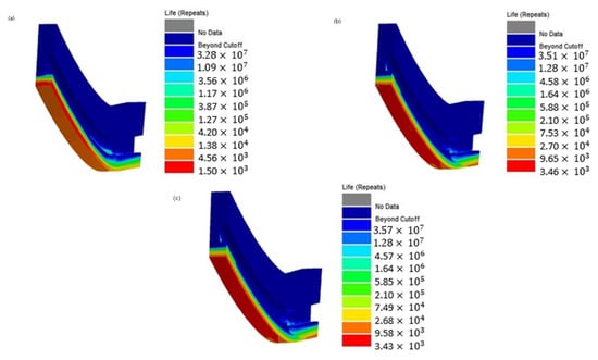 Since the hysteresis curves for the following loading cycles tend to shrink, as highlighted in Figure 15, the corresponding damage contribution is expected to decrease up to nearly zero values after 20–25 cycles. Figure 17 shows the service life contour plots for the first, second and third cycle. As expected, the minimum values occur in the internal surface of the cooling channel where the highest temperatures and thermal gradients are envisaged because of the heating of the hot gases.