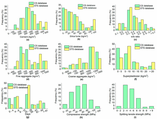 The databases for this paper were compiled from previously published literature [2,3,10,11,25,26,27,28,29,30,31,32,33,34,35,36,37,38,39,40,41,42,43,44,45,46,47,48,49,50,51,52,53,54,55]. The database for CS consisted primarily of data examples on cubic specimens, while data obtained on cylindrical specimens were converted into cubic specimens using suitable factors widely adopted in the literature. The CS of cylindrical specimens of the dimensions was converted into the CS of a cube with dimensions of 150 mm, by multiplying by a factor of 0.98 for high-strength concrete (HSC) (the definition of HSC can be found in ACI 363R) and by 1.1 for normal-strength concrete (NSC). Moreover, the factors 0.9 and 0.96 were used to convert the CS of 100 mm cubes into the CS of 150 mm cubes for HSC and NSC, respectively [56]. The database for STS mainly consisted of data obtained on cylindrical specimens. The results of the STS obtained from cylinders of did not change, while the STS results of cylinders of were converted into the STS of cylinders of by multiplying by a factor of 0.91 [57,58]. For modeling the CS of concrete with SF, 796 data examples were used, while the database for STS was composed of 156 data points. The database for CS can be found in Supplementary Materials (Table S1) as well as the database for STS (Table S2). Each input example included the cement (C), SF, fine aggregate (FA), coarse aggregate (CA), and superplasticizer (SP) dosages, along with the age of the specimen in days, while the CS and STS were the output parameters. The histograms of the variables for both the CS and STS databases are shown in Figure 2. The descriptive statistics of the input and output parameters for the dataset used in the training set are given in Table 1.