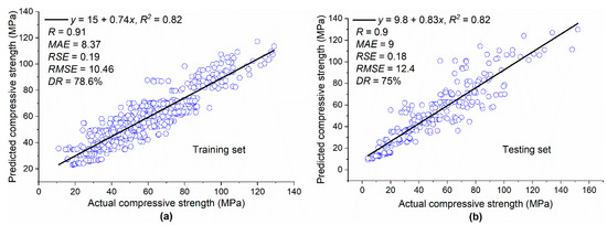 Actual and predicted values of CS: (a) training set; (b) testing set.
