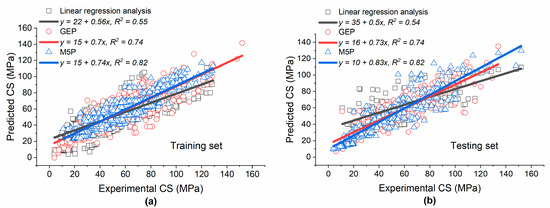 Comparison of the linear regression analysis, GEP, and M5P for the prediction of the CS of concrete made with SF: (a) training dataset; (b) testing dataset.
