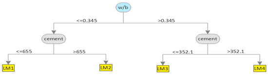 Based on Equation (3), model trees were generated as shown in Figure 4. The term LM at the tree leaves represents the linear model identified by the M5P algorithm. The corresponding coefficients for linear models developed by M5P for CS based on Equation (4) are given in Table 3. Figure 5a,b depict a comparison between the actual results and the model’s predicted values for both the training and testing datasets for the CS database. For both the training and testing sets, the value of R2 was 0.82, which shows that the M5P model was well trained based on the training set and gave prediction results with high accuracy for new data unfamiliar to the model and thus far unseen in the testing set. Moreover, the high values of R and DR and low values of MAE, RSE, and RMSE for both datasets confirmed that the M5P model predicted the CS of silica fume concrete with high accuracy. One of the advantages of M5P over other machine learning techniques, such as gene expression programming, is that it gives a simple linear mathematical equation for predicting the desired property [17] and is not a mere backbox tool.