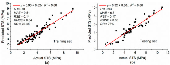 Actual and predicted values of STS: (a) training set; (b) testing set.