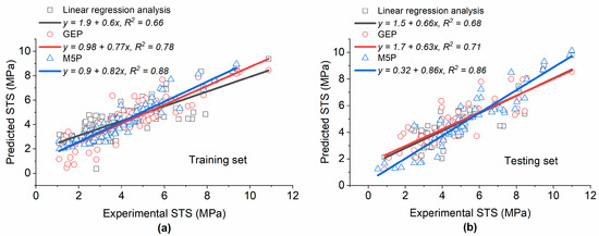 Comparison of the linear regression analysis, GEP, and M5P for the prediction of STS of concrete made with SF: (a) training set; (b) testing set.